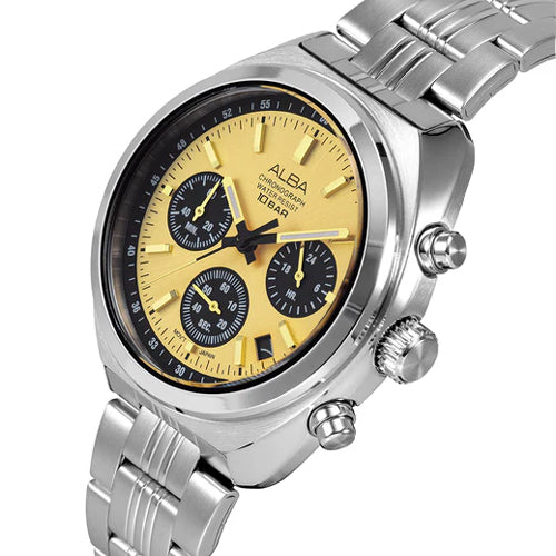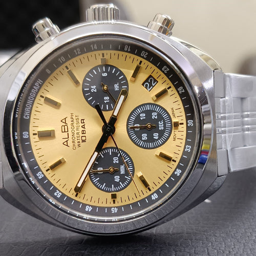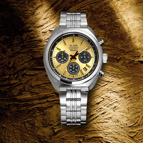 Elevate your wrist game with the ALBA AT3K01X1 — a bold fusion of luxury and precision engineering. This chronograph watch features a radiant gold dial that instantly captures attention, set within a durable stainless steel case for a sophisticated yet commanding presence. Equipped with multi-function chronograph capabilities and a reliable quartz movement, it delivers both style and performance. Designed for the modern man who values elegance with a statement, this timepiece is the perfect finishing touch to both formal and contemporary looks.