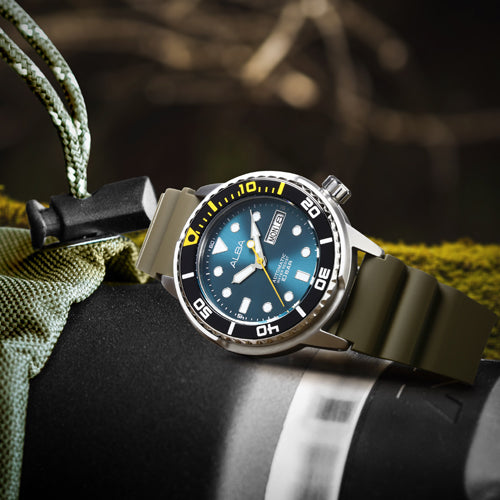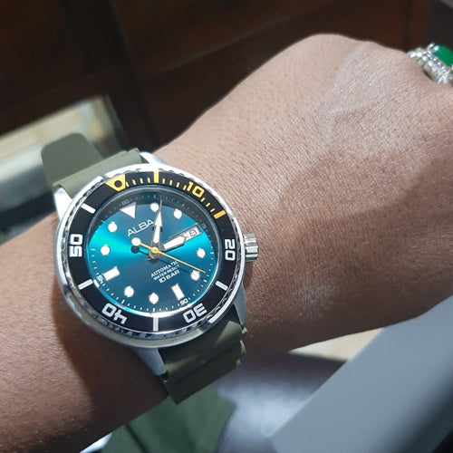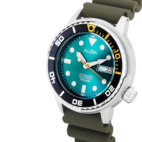 Introducing the Alba Active Watch! This sleek and stylish watch is perfect for everyday wear. The automatic movement means that it is powered by the wearer's movement, so you never have to worry about changing a battery. The silicone strap is comfortable and durable and adds a touch of nature-inspired style. Whether you're dressing up or down, this Alba Watch is a great choice.