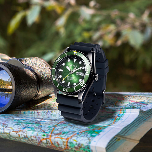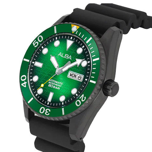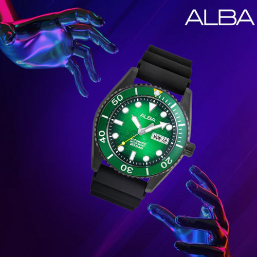 Add a stylish dimension to your look by wearing this men's analog watch watch from the fashion by ALBA. The green round dial is protected by a mineral glass. The silicone strap comes in a black hue that further elevates the look of the timekeeper. Besides, it is completed with a buckle clasp to ensure a secure fit on the wrist.