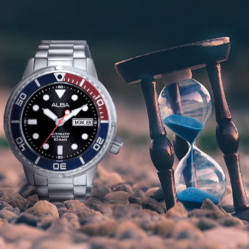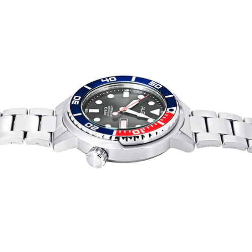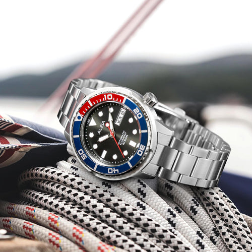 The AL4247X1 Blue-Red Rotating Bezel Automatic Watch is a stunning blend of functionality and style. With its vibrant blue and red rotating bezel, this watch exudes a bold, sporty appeal, making it perfect for both everyday wear and adventurous activities. The sleek stainless steel case houses a precise automatic movement, ensuring reliable timekeeping without the need for a battery. The watch's eye-catching dial features a clean, easy-to-read design, complemented by luminous hands for visibility in low light. Whether you're diving into the deep blue or exploring the urban jungle, the AL4247X1 is a durable and fashionable companion.