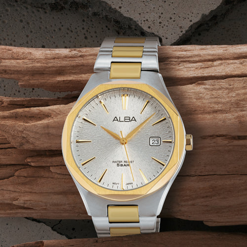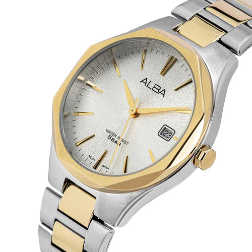 The Alba Prestige AS9U52X1 is an elegant mens quartz watch featuring a 40mm stainless steel case with a white dial and date display. Its two-tone bracelet combines silver and gold tones, offering a sophisticated look. Powered by the Seiko VJ42 movement, it provides reliable timekeeping and is water-resistant up to 50 meters. Ideal for both formal and casual occasions, this timepiece combines classic design with modern functionality.
