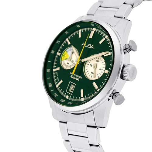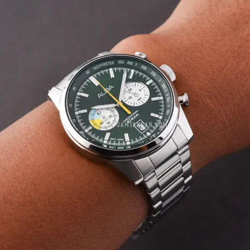 Add a classy touch to your attire by wearing this men's analog watch from the collection by ALBA. The green round dial is protected by a mineral crystal. It features crown for time adjustment. The stainless steel strap flaunts a silver hue that accentuates the look of the watch. Besides, it is completed with a fold-over clasp with safety clasp to ensure a secure fit on the wrist.