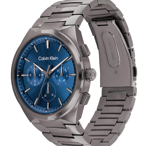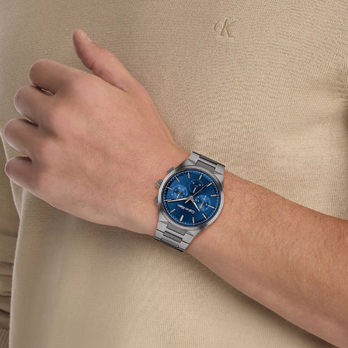 This elevated timepiece features an architecturally inspired case with subtle angularity and a slight curve built into the lugs, complemented by elongated pushers. The sunray dial and minute track highlight an energetic multi-function movement. Available on a dual finish H-link bracelet.