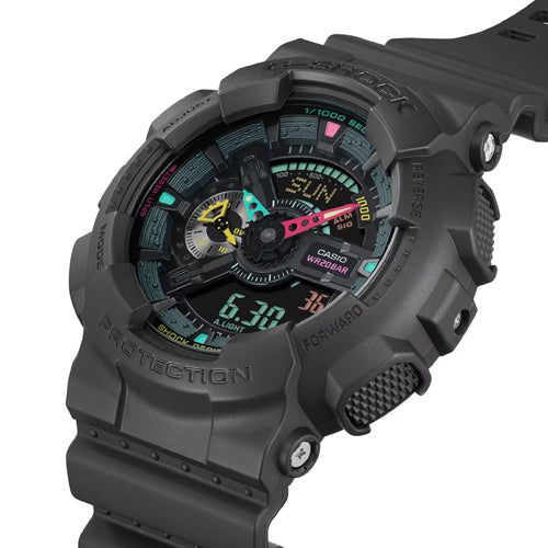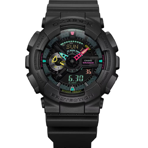 Bold black meets vibrant color in these tough G-SHOCK watches with fluorescent accents. The matte black bezel and band contrast stylishly with touches of vivid blue, pink, and yellow on the hands, hour markers, and dial marks, transporting you to a virtual world. Playful and bold, these designs will crush in any fashion scene. Choose your favorite of five timepieces — the GA-100, GA-110, or GA-700 with large case; the GA-B2100 with octagonal bezel plus Bluetooth and solar charging; or the GX-56 digital watch with large case. Cool matte black and fluorescent colors come together in a stand-out pairing. Which one do you want?