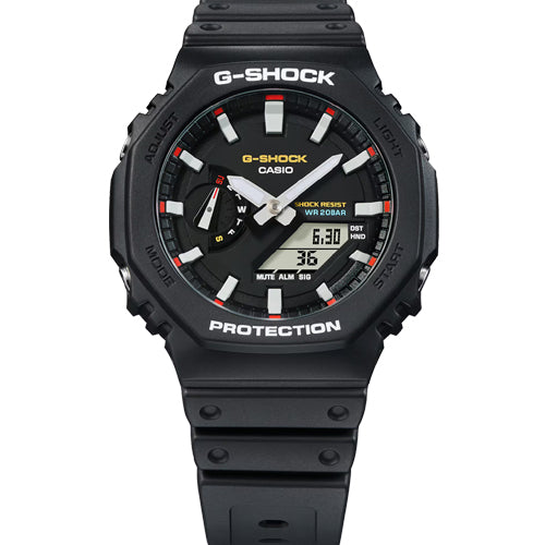 A simple and streamlined watch with octagonal bezel. The original color scheme is faithfully reproduced with touches of G-SHOCK red, representing the passion to take on challenges; blue, symbolizing excellent water resistance; and yellow, signifying outstanding shock resistance.