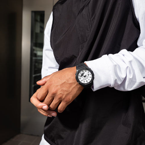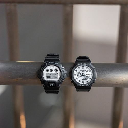 Go bold and confident with a strikingly straightforward G-SHOCK in high-contrast black and white. Beginning with a base of G-SHOCK jet black and then bring in a bright dial finished in brilliant white vapor deposition. The monochromatic statement is a study in contrasts—matte black against glossy white. This abundantly cool design is available in five different models. Choose your favorite — the GA-700 with front button design, the GA-100 or GA-110 with large case, the triple-graph design of the DW-6900, or the GA-2100 with octagonal case.