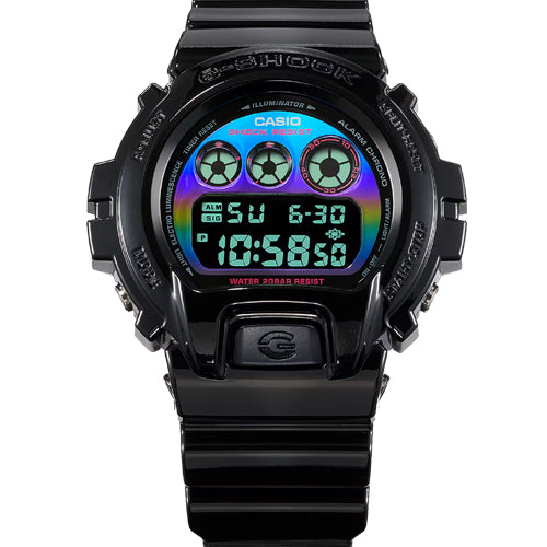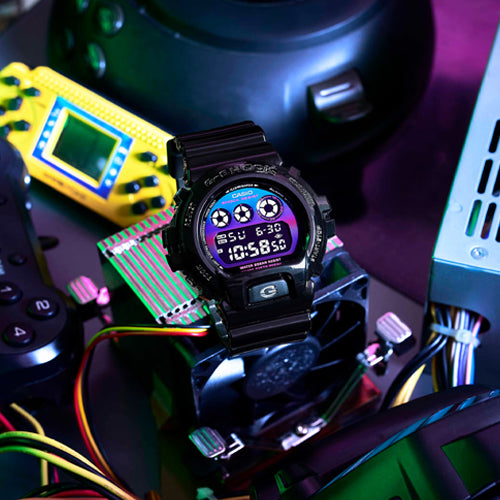 Venture into the Virtual Rainbow lineup — explore the colorful spectrum that emerges when the cybertech game-world aesthetic meets the G-SHOCK quest for the ultimate toughness. The bezels and bands bring in glossy black, while the faces feature rainbow vapor deposition and multicolored designs. The result is a range of bold looks in prisms of cool color lighting up the darkness, which crushes in any fashion scene.