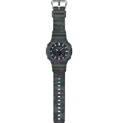 From the toughness-driven G-SHOCK, a design inspired by adventurers whose love of the wilderness knows no bounds. Switch between interchangeable bands and bezels for a thin octagonal GAE-2100 with an even wilder spirit. Green nature-inspired camouflage and vibrant outdoor-fashion orange take you from fashionable urban streets to wilderness exploration in cool, casual style.
