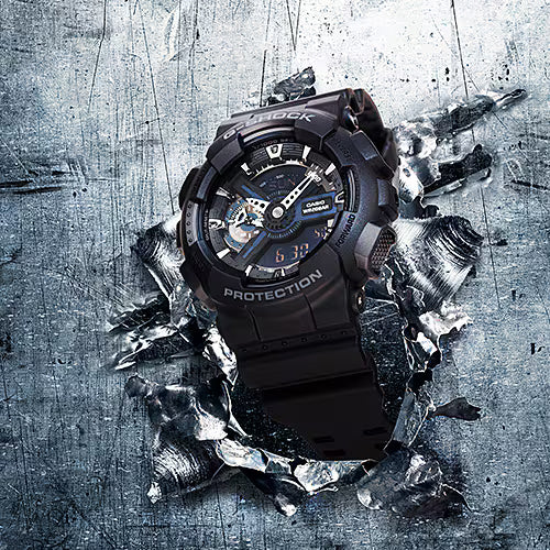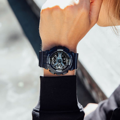 From G-SHOCK in its pursuit of toughness, this model from the GA-110 series features a big powerful face. Black is used as the main G-SHOCK-like color to express more strength. Equipped with a millisecond stopwatch, a speedometer, and JIS class-1 magnetic resistance. Small three-dimensional cog-shaped parts are assembled on the dial, which fuses analog and digital displays and features shiny silver indices that make the design stand out more sharply. A practical and cool model based on the ever-evolving G-SHOCK.