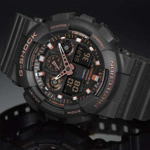 From G-SHOCK, the watch brand that is constantly setting new standards for timekeeping toughness, come new additions to the standard model lineup. The popular DW-9052, big case GA-100, and combination AW-591 start out with basic G-SHOCK black, which is then accented with brilliant rose gold and gold accents. The new gold-accented designs are really attractive additions to the G-SHOCK lineup.