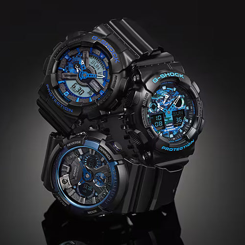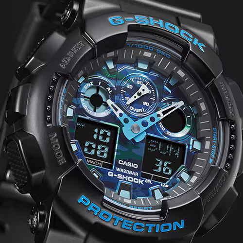 From G-SHOCK, the toughness watches that are ever evolving in an endless pursuit of strength, this model combines a popular blue hue with a brand-color black base. A subdued half-matte black is used for the whole body. Blue is used for the colored parts of the bezel, the dial, and parts of the hour and minute hands to create an intense and cool design. Additionally, the dial features a blue camouflage pattern, and meticulous attention was paid to the design of every detail. A cool color model that makes a strong statement on the casual fashion scene.
