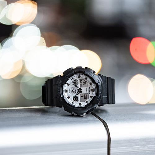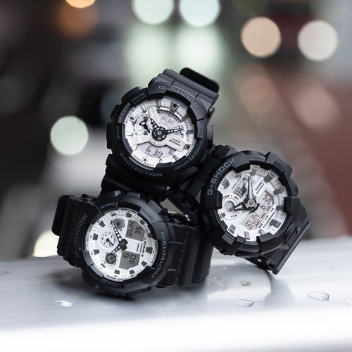 Go bold and confident with a strikingly straightforward G-SHOCK in high-contrast black and white. Beginning with a base of G-SHOCK jet black and then bring in a bright dial finished in brilliant white vapor deposition. The monochromatic statement is a study in contrasts—matte black against glossy white. This abundantly cool design is available in five different models. Choose your favorite — the GA-700 with front button design, the GA-100 or GA-110 with large case, the triple-graph design of the DW-6900, or the GA-2100 with octagonal case.