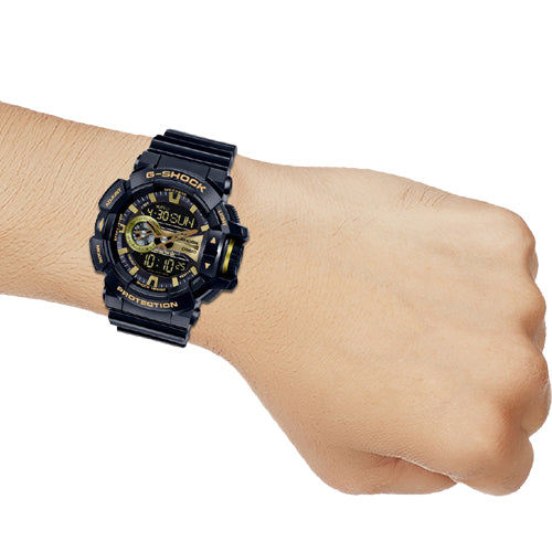 From super-tough G-SHOCK comes a new collection of GA-400 with a large rotary switch for intuitive operation. Basic G-SHOCK black is accented in gold to create a HIP-HOP artist or B-BOY fashion item motif. Black with gold, which are employed in a large number of accessories, is used on the case, band, and face, for a boldly cool design. • ISO764 class magnetic resistance • Rotary switch