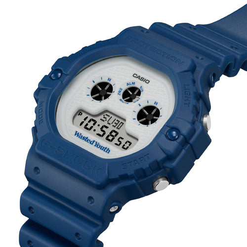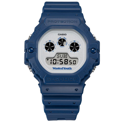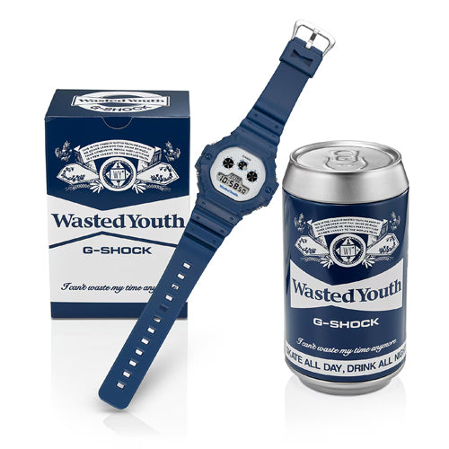 You don’t want to miss out on the G-SHOCK-Wasted Youth collaboration — the first-ever with the globally popular apparel brand from Japan. This fan favorite starts with the iconic DW-5900 digital design in navy blue. The face, in bold splashed white, is patterned with the brand logo that glows in the dark. Press the light button to see the letters W.Y. appear on the LCD display. Wasted Youth The message of graphic artist Verdy with his project Wasted Youth is that “nothing in the journey to get here was a waste.” The Wasted Youth apparel brand collaborates with many Japanese and international brands and frequently surprises with pop-up shops and events. The brand is not just street wear, but also a skate team.