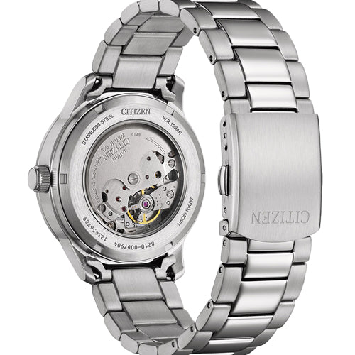 The Citizen NJ0191-83X is a stylish men's automatic watch with a 40mm stainless steel case and matching stainless steel band, offering both durability and a polished look. Its standout feature is the salmon-colored dial, which adds a unique and warm touch, complemented by luminous hands and markers for easy readability. Powered by the Caliber 8210-CA0 automatic movement, it operates at 21,600 vibrations per hour (vph) and includes a date display at the 3 o'clock position. The watch is water-resistant up to 100 meters (10 BAR), making it suitable for swimming and light water activities, while its 12.2mm thickness provides a sleek yet substantial design. It’s a perfect combination of functionality and distinctive style.