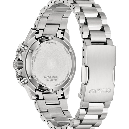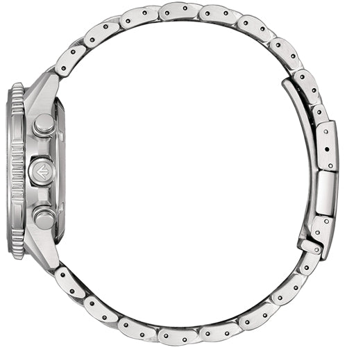 The Citizen CA4660-61A is a men's chronograph watch from the Promastercollection, designed for both style and functionality. It features a 40mm silver-tone stainless steel case with sharp faceting and a satin finish, complemented by a matching triple-link stainless steel bracelet. The white dial includes red, black, and white accents for enhanced legibility, and is protected by a sapphire crystal. A slide-rule scale on the bezel adds flight utility. Powered by Citizen's Eco-Drive technology, the watch harnesses light to operate, no regular battery replacement is required. Additional features include a chronograph function measuring up to 60 minutes, a date display, and water resistance up to 200 meters, making it suitable for various activities.