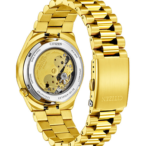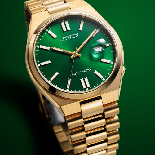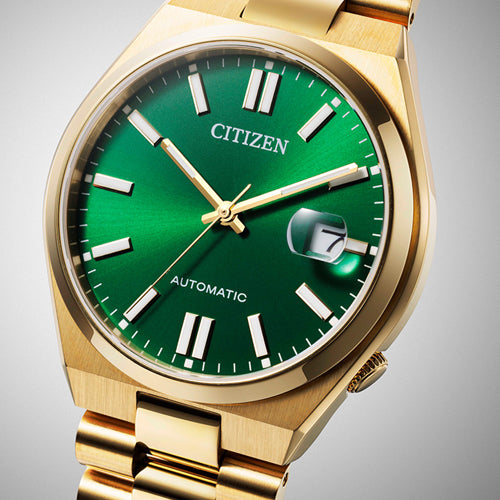 Introducing the new entry to the Tsuyosa collection, a timepiece that merges CITIZEN's esteemed mechanical precision with luxurious design elements. This watch's gold-plated stainless-steel construction radiates the opulence and enduring appeal of gold, offering a striking contrast to the rich green hue of the dial, 40mm in diameter, it provides a robust presence on the wrist that is both noticed and admired.The dial, reminiscent of the verdant greenery of a lush forest, serves as a bold backdrop for the gold-toned slender markers and hands, which add a touch of refined elegance. This vibrant face harmonizes with the functionality of an automatic movement, caliber 8210, ensuring a reliable 42-hour power reserve.A standout feature is the skeleton case back, revealing the complexity of the automatic movement, a testament to the exquisite craftsmanship of watchmaking. It's a detail that will fascinate those who appreciate the intricate mechanics of time.The dial, protected by sapphire glass known for its exceptional scratch resistance and clarity, is paired with a fold-over clasp with a push button, securing the watch with a refined touch. Water-resistant to 5 bar and featuring a magnified date window at 3 o'clock, this Tsuyosa watch is as practical as it is stylish, a companion for the wearer through diverse daily engagements. It's a watch for those who appreciate the seamless blend of classic style with the reliability and sophistication of mechanical innovation.
