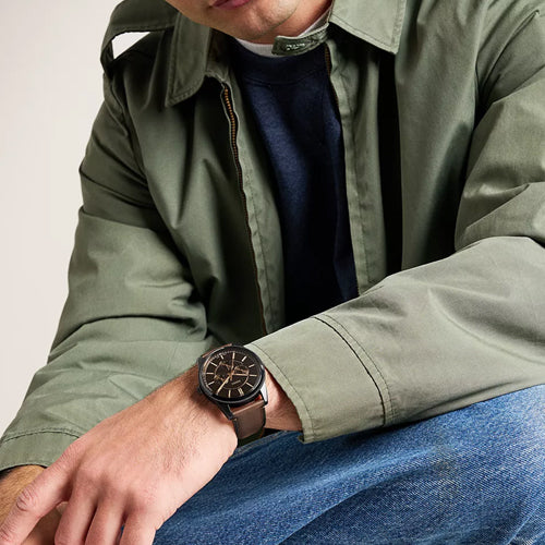A black stainless steel case pairs seamlessly with a rich brown leather strap for a refined yet approachable look. The black sunray dial under an amber crystal, adds subtle depth and texture, complemented by practical sub-dials for day, date, and 24-hour functionality. The round case design balances modern versatility with thoughtful craftsmanship, creating a reliable timepiece designed for daily wear.