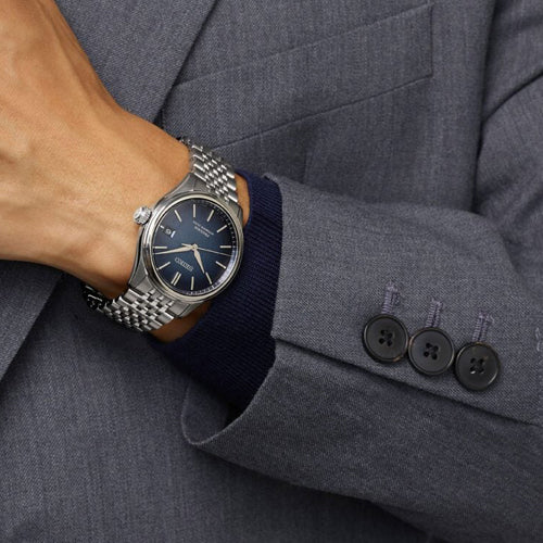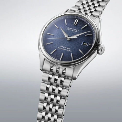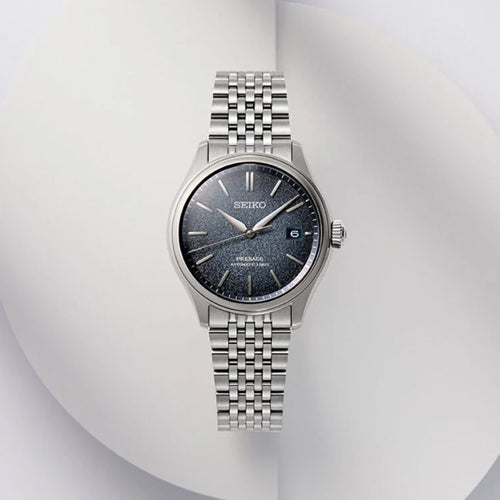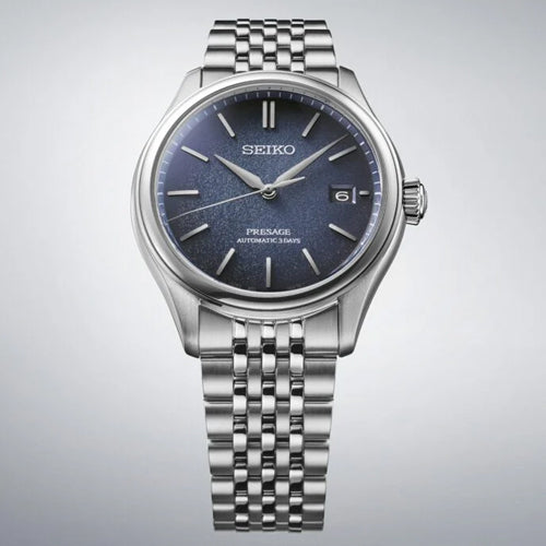 From the Presage Classic Series – watches designed with inherent Japanese elegance, this watch is named ‘Ai-iro’ for its indigo dial – a colour loved during Japan’s Edo period between 1603 and 1868. ‘Ai-iro’ was regarded as a ‘lucky colour’ to Samurai warriors – during the Meiji era of 1868 to 1912, towns would cover themselves in the colour, leading foreign countries to name it ‘Japan Blue.’ Its dial texture is inspired by soft silk – a popular Japanese material since ancient times, often seen in home décor and clothing. Under dual-curved sapphire glass, the domed dial with curved hands and indices evoke vintage style and are specifically designed to maximise light reflections. The seven-piece multi-row bracelet has been developed and inspired by 1970s retro metal watch bracelets. Not only are these designed for style and to reflect the light, each piece is short at only 6mm long, allowing for maximum movement and comfort. This Classic Series timepiece is powered by an in-house built 6R55 calibre, accurate to -15/+25 seconds per day, with a three-day 72-hour power reserve.Seiko Presage: Timeless looks, precise mechanical timekeeping. Minimalistic watch designs with a distinctly Japanese aesthetic.