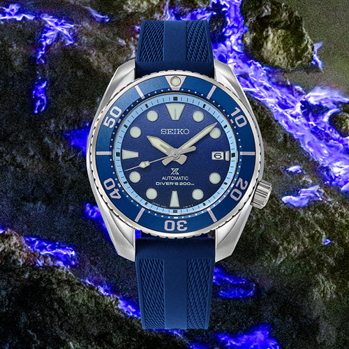 Evoking the Blue Fire Crater of Indonesia. The deep blue tones express the powerful and enigmatic energy of this extraordinary natural spectacle. Caliber 6R35 automatic movement (approx. 70-hour power reserve), Sawaterresistance,Straight-shaped silicone strap for enhanced comfort and modern appeal, LIMITED EDITION and serial number on the case back, Presented in a specially designed box based on the theme of the the wonders of nature.