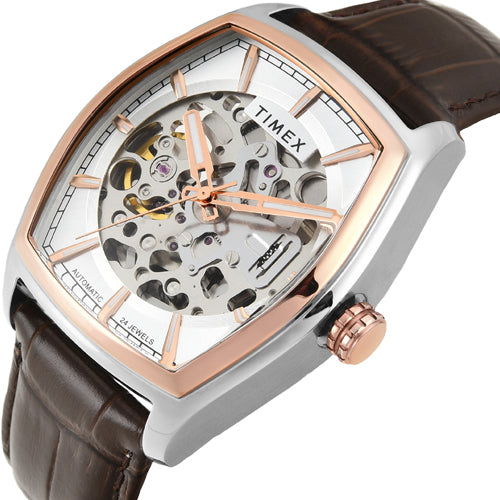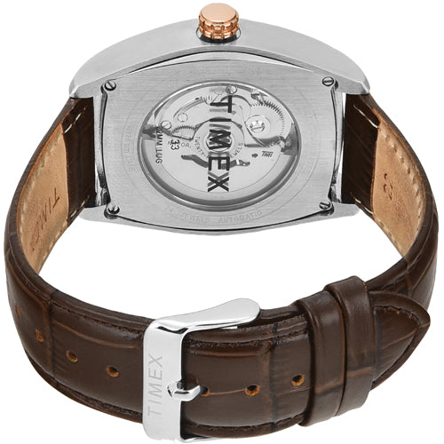 Add the perfect finishing touch to your OCCASION look with this men's analog watch by Timex. Its leather strap showcases a silver hue that uplifts the look of the watch. Housed in a 38.4 mm case, the silver tonneau dial is protected by a mineral glass. It showcases plain three hands. Furthermore, it is complemented with a buckle clasp that ensures a secure fit on the wrist.