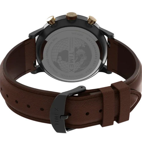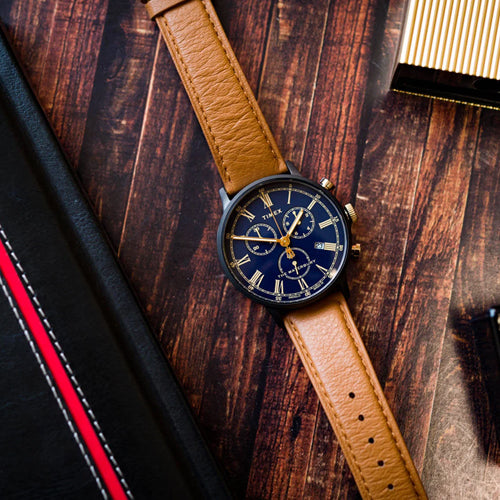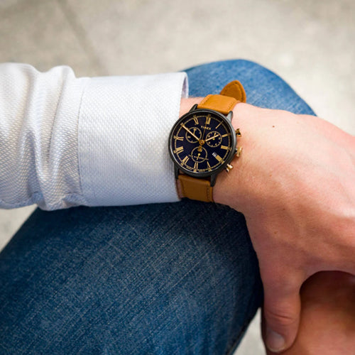 We have looked to our past, and We’ve paying homage to our original watch collection by using the Waterbury Watch Company logo on the dial and second hand, which bears the stylized W. Each watch displays our attention to craftsmanship and detail, with finely-finished surfaces and careful applications of watchmaking ingenuity. Featuring a gunmetal stainless-steel case and gold accents, a classic navy dial with Roman numerals and a rich tan natural leather strap, our Waterbury Classic Chronograph unites all of these elements into something that delivers function just as well as form.