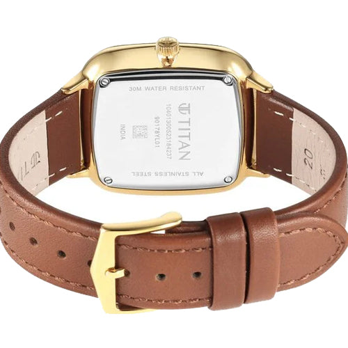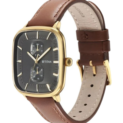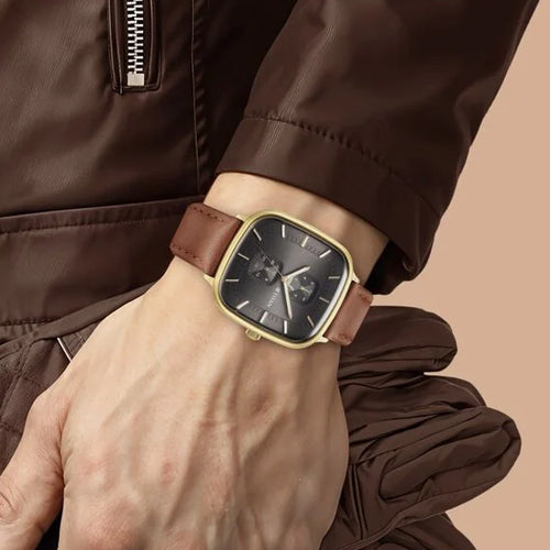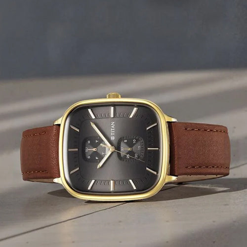Experience classic charm with this brown and black combination timepiece. The sharp rectangle black dial, adorned with gold bezel detailing, features a subtle sheen and textured elements. Silver indices and gold hands complement two sub-dials for precise day and date tracking. The warm-toned brown leather strap ensures perfect comfort, making it an ideal accessory for all workwear.