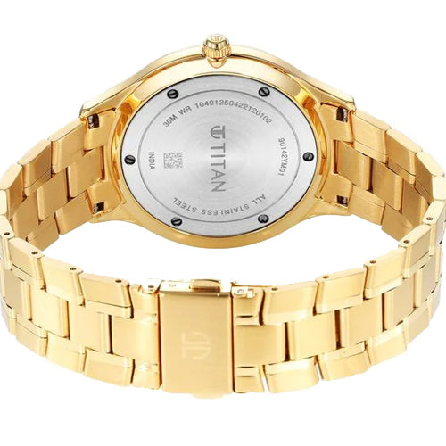 Designed to suit the preference of urban men, this analog watch from Titan is sure to make a style statement. The champagne round dial is protected by a mineral glass. The stainless steel strap comes in a gold hue that further elevates the look of the timekeeper. Besides, it is completed with a fold-over push button clasp with safety clasp to ensure a secure fit on the wrist.