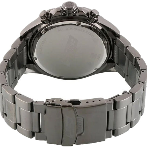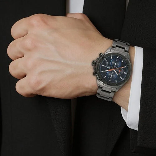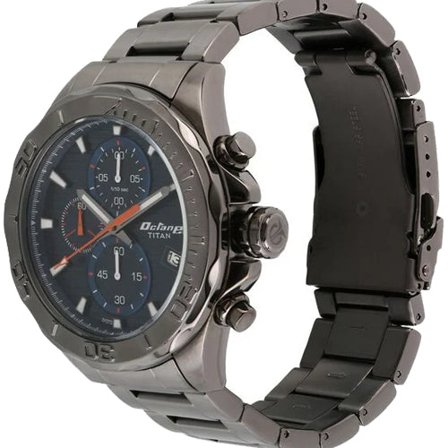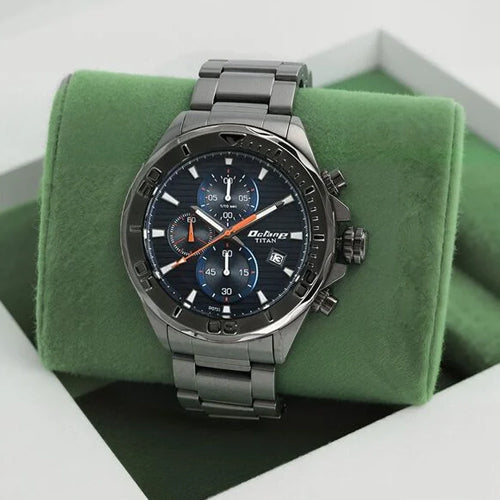 From the house of Titan comes this Octane collection, blue dial chronograph watch for men. The dial face exudes edgy glamour with white hands, a vibrant orange second's hand and white hour marks set against a handsome blue background. The logo emblazoned across completes the dashing look. With a silver stainless steel strap, durable mineral glass cover, rotating bezel, 1/10 chronograph second function and a diver's clasp locking mechanism that never lets you down, this timepiece is a mark of uncompromising quality. For the dapper male, this trendy watch that comes with a two-year warranty is the ultimate expression of distinctive individuality.