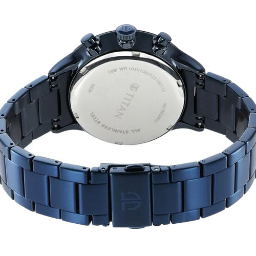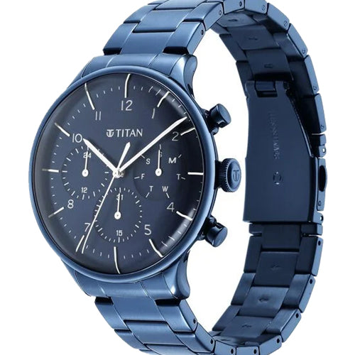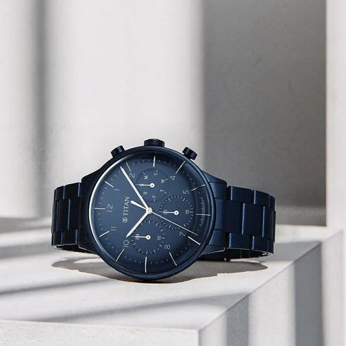 Amaze everyone around you by wearing this analog watch from TITAN. Encased in a 42 case, the blue round-shaped dial, features a multifunction functionality, quartz movement and a crown for time adjustment. The stainless steel bracelet comes in a blue hue that further elevates the look of the watch. Besides, it has a water resistance of up to 30 m and is completed with a push button clasp to ensure a secure fit on the wrist.