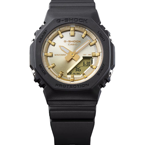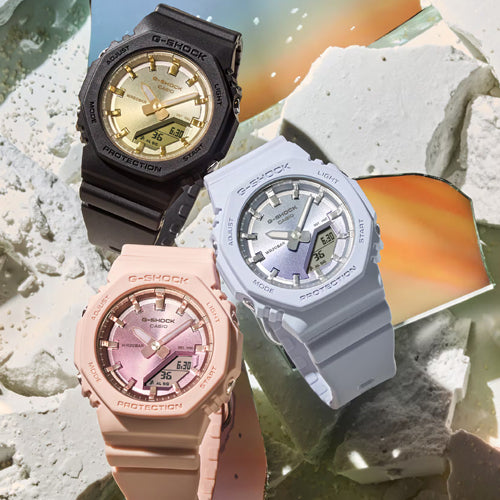 Soak up the shimmer of a timepiece inspired by gorgeous summer sunsets. The glitter of the sun going down over the water at the end of a beautiful summer day is captured using vapor deposition in a lustrous gradation of new colors on the dial. We begin with the GMA-P2100, an even more compact version of the popular digital-analog combination GMA-S2100, and adjust the length of the band to better fit slimmer wrists. We eliminate the original 9 o’clock inset dial for a streamlined, minimalist look, and use stainless steel for the buckle and side buttons to add a touch of luxury. Key resin components used in the bezel and band are made with bio-based resin. Produced using renewable organic resources, this material is expected to help reduce environmental impact. New colorways bring luxe resort flair to your wrist and wardrobe, while environmentally responsible materials keep the beauty of the beach front and center.