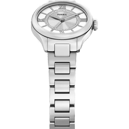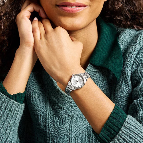 Crafted entirely in silver-tone stainless steel, this watch pairs a sleek, round case with a matching bracelet for a refined monochromatic look. The satin sunray dial continues the silver-tone design, creating a cohesive finish enhanced by understated detailing. Designed with a three-hand configuration, its minimalist approach emphasizes precision and simplicity. The polished bracelet and streamlined dial highlight thoughtful craftsmanship and modern styling.