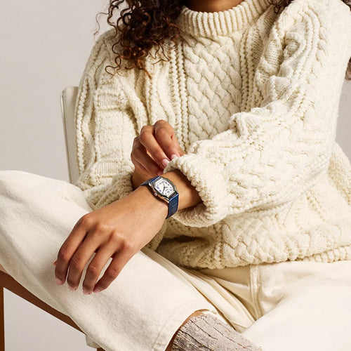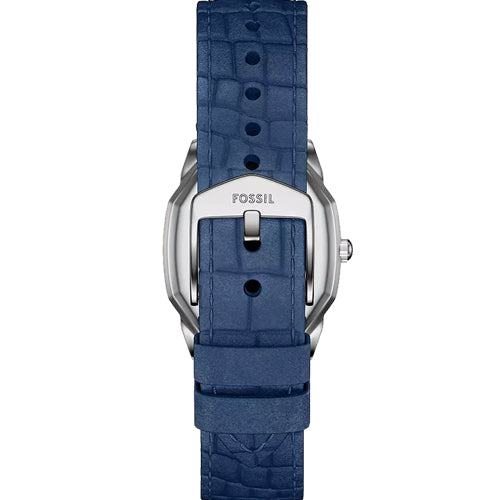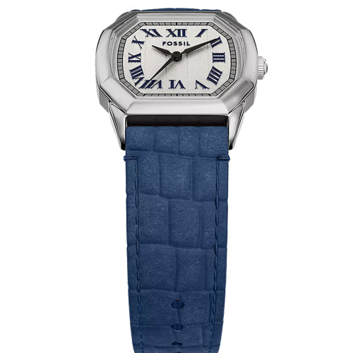 This small silver-tone octagonal case pairs beautifully with a textured cream dial and navy croco-embossed leather strap. The unique shape of the case creates a modern geometric silhouette, complemented by the soft contrast of the leather's deep blue tone. Thoughtfully crafted from stainless steel, the polished finish adds refinement, while the textured dial enhances depth and detail. The combination of materials and design elements makes this piece a standout accessory with a fresh and approachable aesthetic.