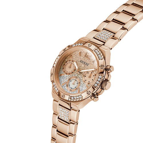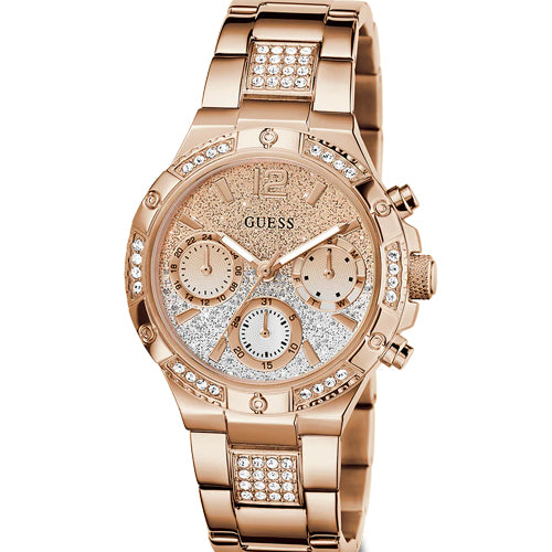 Add some sparkle to your style with this beautiful timepiece! The 38 mm rose gold case features crystal on its bezel and pairs beautifully with a rose gold and silver ombre glitter multi-function dial. A polished rose gold stainless steel bracelet with a touch of crystal completes this dazzler of a look!