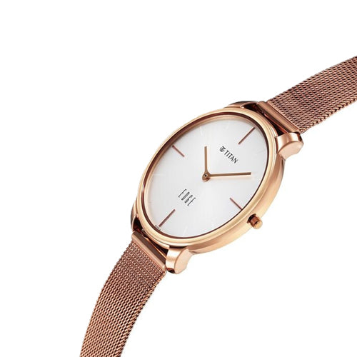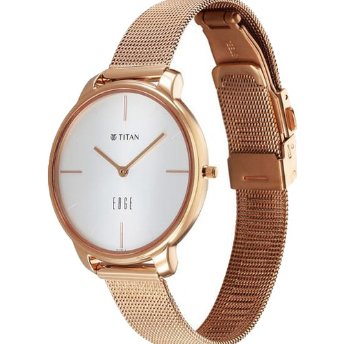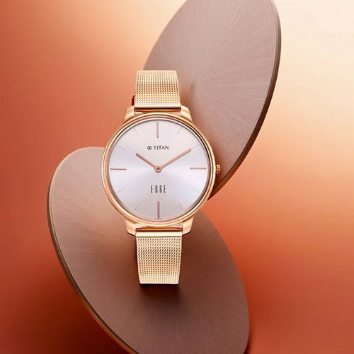 A remarkable watch from the Edge by Titan, this piece is known for its sleek and sophisticated design. This timepiece is powered by the T9081 in-house calibre movement, ensuring precision and reliability. Crafted from high-grade stainless steel, it features a delicate rose gold finish, elevating its elegant appeal. Merging luxury with minimalism, it is perfect for both formal occasions and daily wear. It is complemented by a stylish mesh strap that enhances comfort while maintaining a chic look. The case thickness is a mere 3.9 mm, reflecting the Edge series' hallmark of ultra-thin design, and the diameter measures 34.5 mm. Protected by a durable mineral glass, the watch showcases a striking white dial with a sunburst finish, adorned with elegant rose gold-toned hands, providing a clear view of the time. With a water resistance rating of up to 30 meters, it is suitable for everyday use. The Titan Edge is designed for the modern woman who values style and functionality in her accessories. Whether at a business meeting or a social gathering, this watch is sure to make a statement while effortlessly complementing any outfit