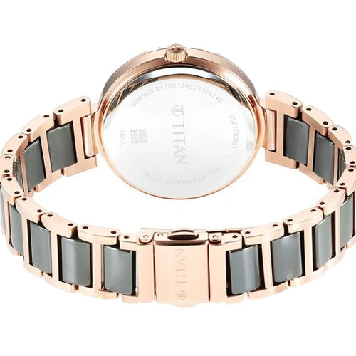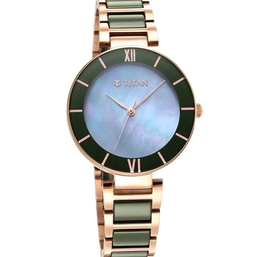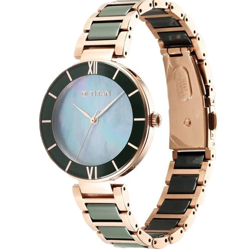 Blending functionality and style, this women's analog watch from the Purple Ceramics collection by Titan is a must-have. Its blue round dial is housed in an elegant case. It displays plain three hands functional on a quartz movement and a crown for time adjustment. Its ceramic bracelet vaunts a green hue that enhances the look of the watch. Moreover, it is fitted with a push-button clasp to ensure a secure fit on the wrist.
