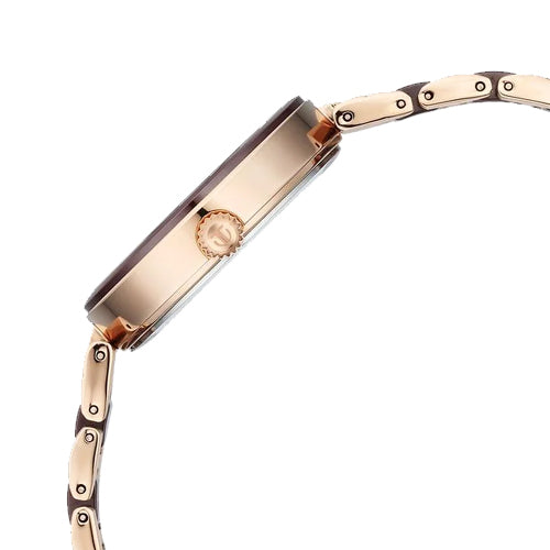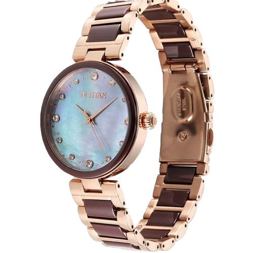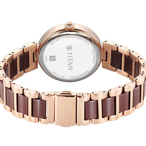 Dazzle onlookers by adorning this analog watch from Titan. Encased in a 34 mm case, the brown round-shaped dial, features a plain 3-hand functionality, quartz movement and a crown for time adjustment. The steel and ceramic bracelet comes in a gold hue that further elevates the look of the watch. Besides, it has a water resistance of up to 30 m and is completed with a push button clasp to ensure a secure fit on the wrist.