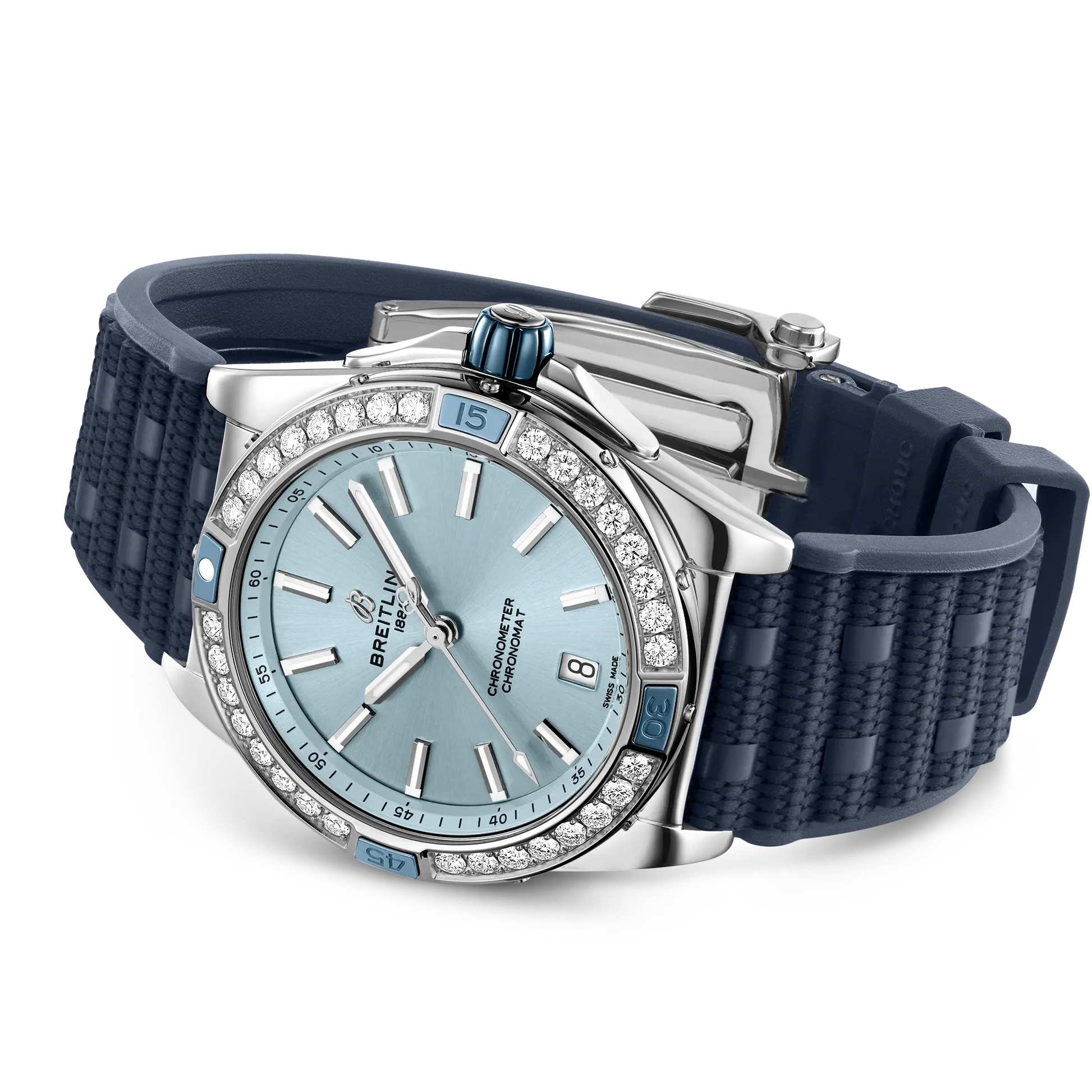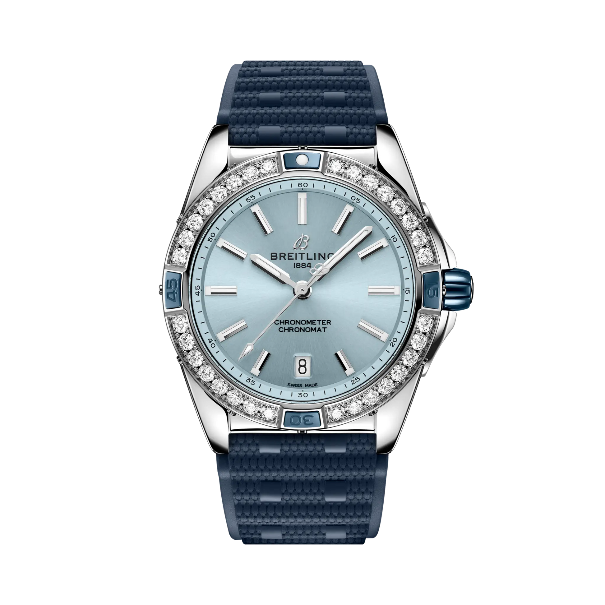 The Super Chronomat Automatic 38 is designed to make a statement, whether paired with a power suit or a t-shirt and jeans. You can tell a Super from the rest of the Chronomat family by the ceramic rider tabs and crown, and the rubber rouleaux bracelet only available with this supercharged line. Aside from its enhanced presence, the Automatic 38 also has a radiant side. Oversized lab-grown diamonds make the rounds of its 18k red gold or stainless-steel bezel. Its dial colors add just the right amount of eye candy. Pair a favorite shade with a choice of bracelet or strap.