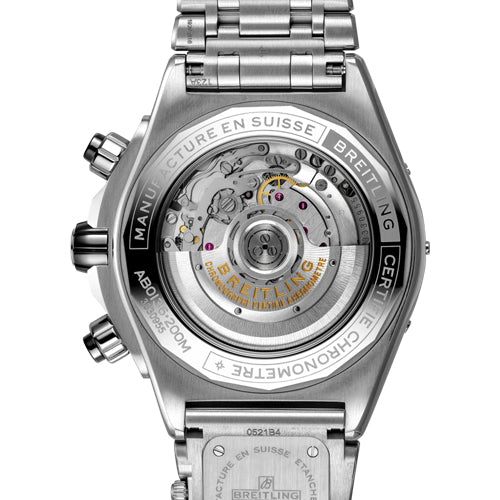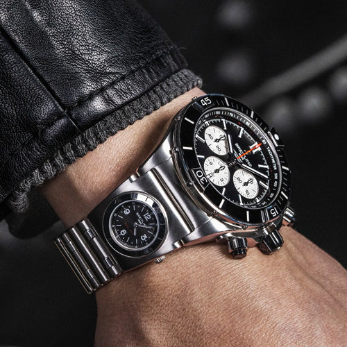 The boldest of all Chronomat watches, the Super Chronomat features several ceramic inserts – on the bezel, on the chronograph pushers and on the crown – as well as a Rouleaux-inspired rubber strap. Also, a UTC module is embedded in the Rouleaux bracelet. UTC stands for Coordinated Universal Time, and it provides a way to keep track of a second time zone and is a quirky Breitling feature dating back to the 1980s