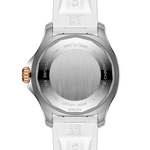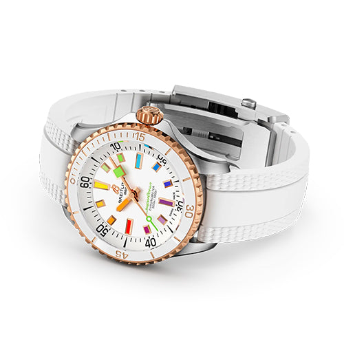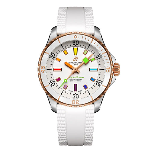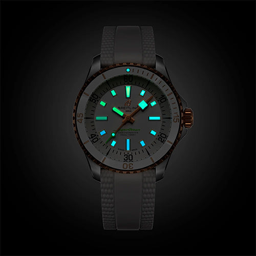 Performance and style for all your water-based pursuits. In the 1960s, the new sport of scuba diving was all the rage. For divers, timing was everything, and Breitling set out to give them the most clear-cut dive watch possible by eliminating any feature that didn’t support their lifesaving needs underwater. This pared-down watch was named the Superocean Slow Motion. What remained were clean lines, chunky luminescent indexes, squared-off hands and a high-contrast dial ring, all aimed at maximum legibility. Practical, yes. But what people really fell in love with was the look. The new Superocean retraces the Slow Motion's celebrated design codes, while adding modern features, like a scratch-proof ceramic-inlayed bezel and brightly colored dials. Broad hands and indexes in a rainbow gradient of luminescent Super-LumiNova® allow for easy readability (and extra fun). The watch is water resistant to 300 m (1,000 ft), as well as being shock-, sand- and saltwater-resistant. The bronze version uses a special alloy that has excellent resistance to corrosion, yet will still develop a subtle patina over time that makes the watch even more unique. The rubber strap comes with a folding clasp that allows for micro-adjustments of up to 15 mm for easy wear over rashies and wetsuits. For safety, the bezel is uni-directional. Best of all, this is no longer strictly a dive watch—surf with it, swim with it, hit the beach bar with it, then wear it out to dinner. The Superocean perfectly balances the nostalgia of its heritage with a fresh new look.