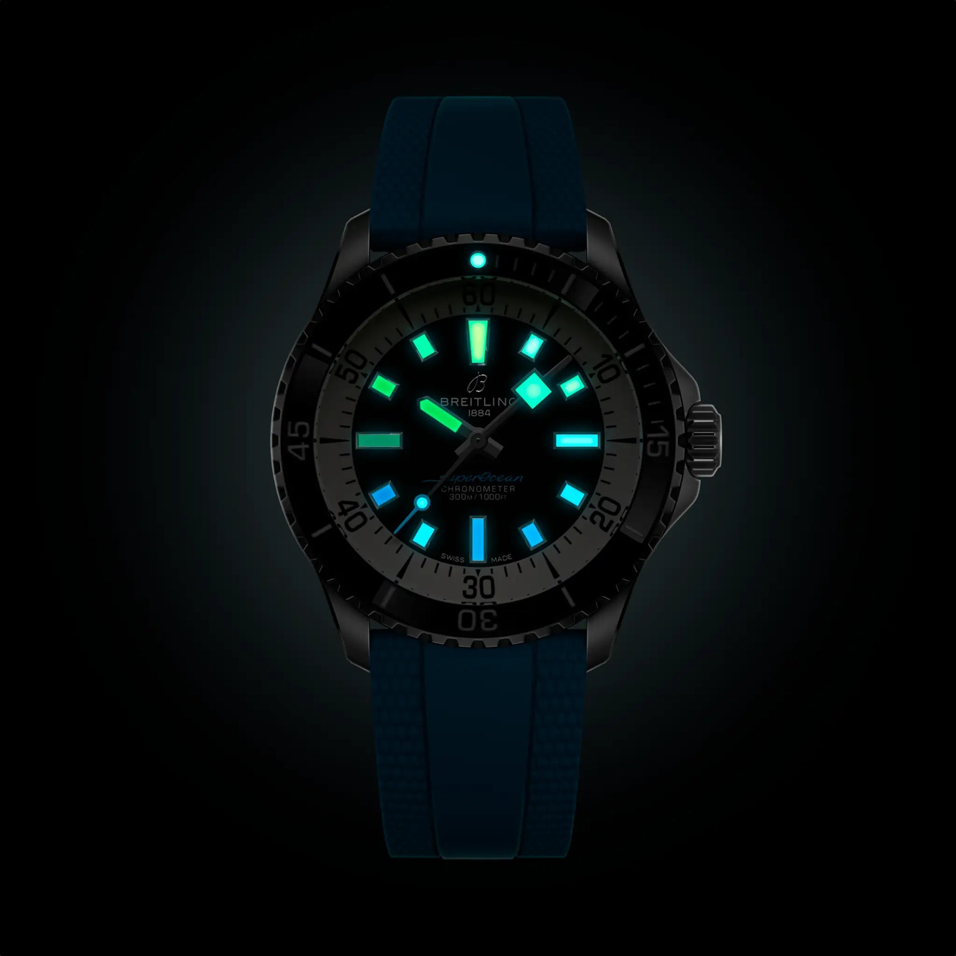 Performance and style for all your water-based pursuits. In the 1960s, the new sport of scuba diving was all the rage. For divers, timing was everything, and Breitling set out to give them the most clear-cut dive watch possible by eliminating any feature that didn’t support their lifesaving needs underwater. This pared-down watch was named the Superocean Slow Motion. What remained were clean lines, chunky luminescent indexes, squared-off hands and a high-contrast dial ring, all aimed at maximum legibility. Practical, yes. But what people really fell in love with was the look. The new Superocean retraces the Slow Motion's celebrated design codes, while adding modern features, like a scratch-proof ceramic-inlayed bezel and brightly colored dials. Broad hands and indexes in a rainbow gradient of luminescent Super-LumiNova® allow for easy readability (and extra fun). The watch is water resistant to 300 m (1,000 ft), as well as being shock-, sand- and saltwater-resistant. The bronze version uses a special alloy that has excellent resistance to corrosion, yet will still develop a subtle patina over time that makes the watch even more unique. The rubber strap comes with a folding clasp that allows for micro-adjustments of up to 15 mm for easy wear over rashies and wetsuits. For safety, the bezel is uni-directional. Best of all, this is no longer strictly a dive watch—surf with it, swim with it, hit the beach bar with it, then wear it out to dinner. The Superocean perfectly balances the nostalgia of its heritage with a fresh new look.