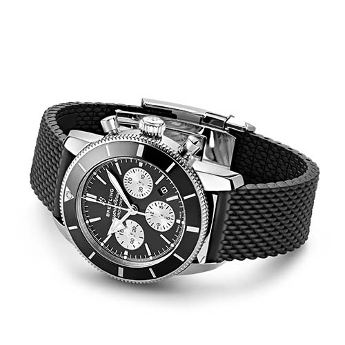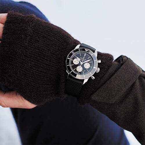 Super performance for all your water-based pursuits. In the 1960s, the new sport of scuba diving was all the rage. For divers, timing was everything, and Breitling set out to give them the most clear-cut dive watch possible by eliminating any feature that didn’t support their lifesaving needs underwater. This pared-down watch was named the Superocean Slow Motion. What remained were clean lines, chunky luminescent indexes, squared-off hands and a high-contrast dial ring, all aimed at maximum legibility. Practical, yes. But what people really fell in love with was the look. The Superocean Automatic 46 Super Diver retraces the Slow Motion's celebrated design codes, while adding modern features, like a scratch-proof matt ceramic-inlayed bezel and camouflage dials. Broad hands and indexes in luminescent Super-LumiNova® allow for easy readability underwater. The watch is water resistant to 1,000 m (3,300 ft), as well as being shock-, sand- and saltwater-resistant. And there’s much more to this watch than meets the eye: Its soft-iron inner case offers protection against the effects of magnetic fields, while its bi-directional rotating bezel can be safely secured with a lock on the left side of the case. The two strap options (rubber or titanium bracelet) have a folding clasp that allows for micro-adjustments of up to 15 mm for easy wear over rashies and wetsuits. Best of all, this is no longer strictly a dive watch—surf with it, swim with it, hit the beach bar with it, then wear it out to dinner. The Superocean perfectly balances the nostalgia of its heritage with a fresh new look.