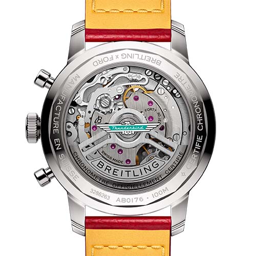The 1960s was a decade of experimentation, fun, freedom and energy. Whether cruising on a motorcycle or revving up a sportscar, living life at full speed was the order of the day. Willy Breitling felt this change of pace and set out to design an unconventional chronograph that would capture the verve of era. He called it the Top Time. That spirited tradition continues today with Breitling partnering with some of the coolest names in wheels to create its Top Time designs. The Ford Thunderbird was first unveiled at the 1954 Detroit auto show. It was touted as a fun-to-drive cabriolet that made its presence felt with its luxurious design, solid build and dramatic tailfin. The Top Time B01 Ford Thunderbird features the colors and emblem of its classic-car counterpart as well as a perforated leather racing strap, speed-measuring tachymeter scale and contrasting “squircle” (not quite square, not quite round) subdials that give the feel of vintage dashboard gauges. It also comes with a brag-worthy engine under the hood: the exceptional Breitling Manufacture Caliber 01.