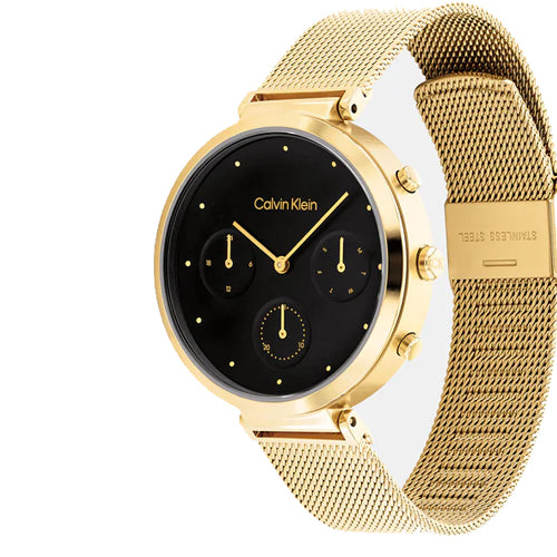 The Calvin Klein 37 mm Quartz watch for women exemplifies superior craftsmanship. A testament to contemporary elegance, its black round chronograph dial and gold mesh band complements any casual outfit. Surrounding it is a 37 mm stainless steel case that adds durability. It features a mineral dial window, 3ATM water-resistance, and a 2-year warranty.