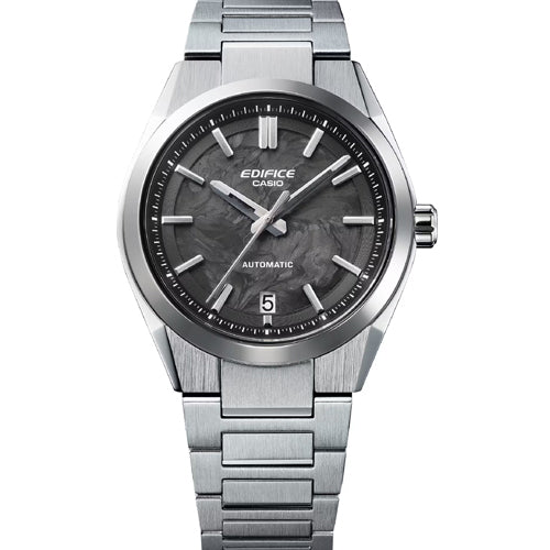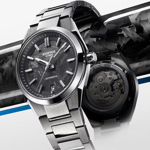 Introducing the analog EFK-100CD, a high-end EDIFICE that features forged carbon and a classic three-hand design. The dial features the state-of-the-art forged carbon used in high-end sports cars, capturing the exhilaration of a sports car speeding toward higher performance in a distinctly EDIFICE style. Forged carbon is a composite material of carbon fiber kneaded into resin and then forged at high temperatures under intense pressure, and it is both stronger and lighter than metal. The mechanical movement with 40-hour reserve powers the watch hands like a humming sports car engine, all housed in a compact 39mm case. The see-through case back reveals the movement in motion, reinforcing the unique appeal of a mechanical watch. The raised indexes, sharp case and bezel design, and sapphire crystal project premium quality all the way. Water resistance up to 100 meters leaves you free to focus on more exciting things. Designed to thrill the most passionate car enthusiast.
