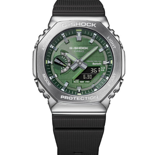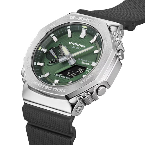 Metal-clad daring meets sophisticated gleam in a GBM-2100 that delivers Smartphone Link via Bluetooth® and Tough Solar charging system, all in a meticulously finished metal design with iconic octagonal bezel. Choose from a basic black dial or metallic vapor deposition in blue or green, each complemented by a band made of environmentally responsible bio-based resin. Welcome to a whole new level of metal-clad 2100 functionality — tough construction and stylish design in a timepiece that takes you from casual settings to business meetings without a thought.