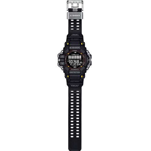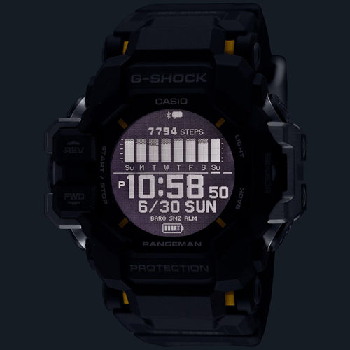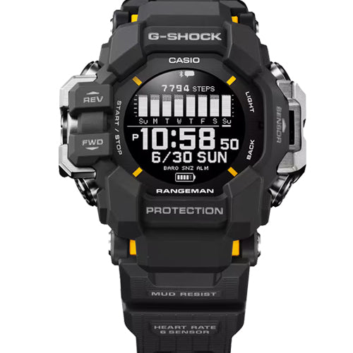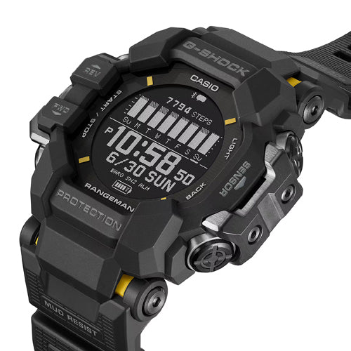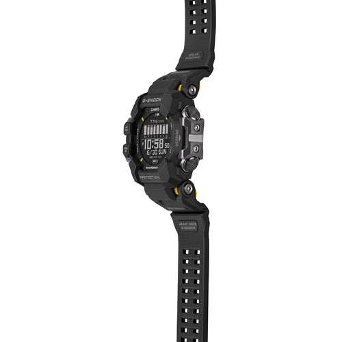 Conquer demanding terrain and feel amazing with a rugged timepiece as bold and active as it is tough. Designed to work even in the harshest environments, the RANGEMAN GPR-H1000 from the MASTER of G line is a truly tough piece of outdoor gear. With a mud-resistant structure to keep out fine dust and dirt, it is designed to withstand the most punishing conditions and the worst weather situations. This muscular timepiece is equipped with a heart rate monitor, built-in GPS functionality, and a high-definition, high-contrast memory-in-pixel (MIP) LCD for an easy read. The case is guarded by sizable metal components on the left and right, protecting the GPS antenna and six sensors inside, to deliver what you need for a wide range of activities. The trekking function allows you to check your heart rate while on the move so you can keep track of your physical condition during workouts. Check the tide graph for low and high tides to get the most out of water sports. Enjoy all this functionality, with no sacrifice in comfort. The soft urethane band delivers a comfortable fit that your wrist will love and is textured on the top side so that even wet fingers can tighten it without slipping. The case, bezel, and band are made with bio-based resin, a material expected to help reduce environmental impact. With the engraved silhouette of the RANGEMAN wild cat character on a band piece, every detail of this timepiece exemplifies the spirit of this MASTER of G line of specialty watches.