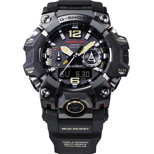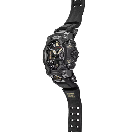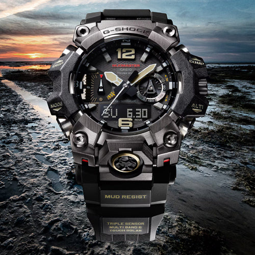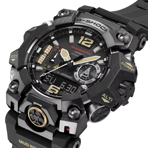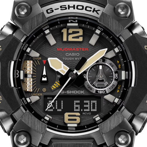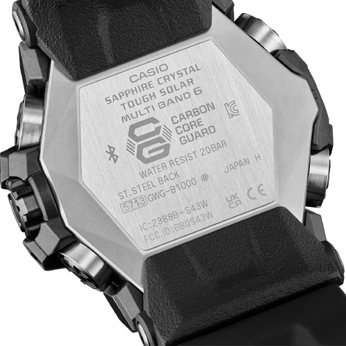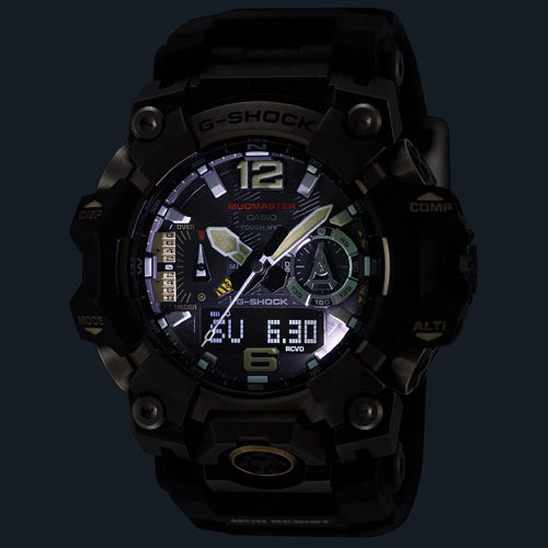 Enjoy both fearless adventure and a comfortable fit with this tough and rugged Master of G Mudmaster flagship timepiece. This analog-digital combination watch delivers more comfortable fit and outstanding durability with a robust exterior incorporating a guarding structure built with metal components. The watches of the G-SHOCK Master of G line, developed for professionals working in the harshest environments, come equipped with even tougher functionality. And the MUDMASTER takes this even further with the ability to handle the roughest on-land environments, earning the appreciation and trust of rangers and rescue teams operating in extreme environments. The comfortably sized GWG-B1000 features a metal exterior crafted with high-precision forging techniques and a carbon fiber-reinforced resin case*1 that offers high strength and outstanding durability. Radio-controlled and solar-powered, the watch is also equipped with a triple sensor that keeps you updated with direction, altitude, barometric pressure, and temperature readings. Double LED lights and sapphire crystal ensure high readability so you always see the time and other readings, no matter what the conditions are like. Input a specific location in the app and the Location Indicator function moves the indicator hand at the 3 o’clock position to point in that direction so you stay on track at all times — even when visibility is obstructed by extreme conditions like sandstorms. The use of bio-based resins for the case, some bezel components, and the band make for a watch that demonstrates the MUDMASTER commitment to the environment. *1 Due to the characteristics of carbon fiber-reinforced resin, the pattern and color tone that appears on the surface will vary model by model.