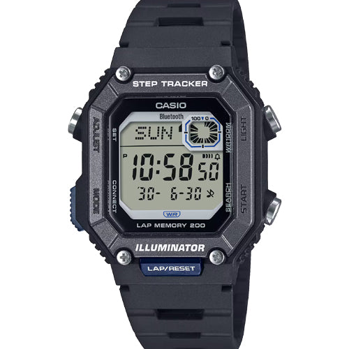 Simplicity in design with the functionality to make everyday life even more convenient. Slip into a clean, compact digital watch with Bluetooth® pairing — an ideal companion, whether running daily errands, playing sports, or working on wellness. The WS-B1000 boasts a 1/100-second stopwatch with a 200-lap memory, plus step tracker to help manage daily fitness. The built-in accelerometer senses body movements and automatically counts steps. In addition to displaying the number of steps taken that day on the LCD, the watch shows a graphic that shows progress on your goals. This watch is sure to support your active lifestyle. Smartphone pairing via Bluetooth® delivers automatic time correction and makes it easy to configure alarm, world time, and other functions from the app. Step counts and stopwatch times measured on the watch can be transferred to and viewed on the phone. Use this log data to guide daily exercise and help manage your health. The slim, compact design with front button makes data management easy during activities, and the perforated urethane band delivers breathability, a comfortable fit and relaxed wearability. Water resistance up to 100 meters frees you from worry, even in sudden rain.