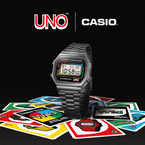 Introducing a one-of-a-kind design that brings together the nostalgia of Casio and the classic card game sensation you know and love, Mattel’s UNO This singular collaboration begins with the popular vintage style of the A168 watch and features an UNO™ motif that honors the game’s classic 1979 design. The dial is adorned with the colors of the almighty Wild card — giving the player the choice of red, blue, yellow, or green. Activate the EL backlight and see the word “Wild” appear on the LCD. The classic theme is echoed in the original UNO™ logo on the dial. Set against a case that is ion plated in gun metal gray, the band in black ion plating is complemented with a buckle subtly engraved with an illustration of the back of an UNO™ card. The engravings on the case back feature the UNO™ logo and, for a hidden touch of whimsy, three of the game’s cards — the 1, 6, and 8 arranged in order of the watch’s model number. This timepiece comes in special packaging that not only features the four classic UNO™ colors, but is also made from recycled materials in commitment to the environment. You won’t want to miss out on this great hand — a very special collaboration between UNO™ and Casio, two brands launched in the 1970s with fans around the world to this day. Mattel Games Mattel produces games that deliver fun with friends and family for players of all ages. The lineup includes UNO™, the classic card game that is as popular today as when it debuted in 1971; Blokus, a game of strategy used as educational content for children and in corporate training programs; and Bounce Off, a new action game that has many people hooked with its simple rules.